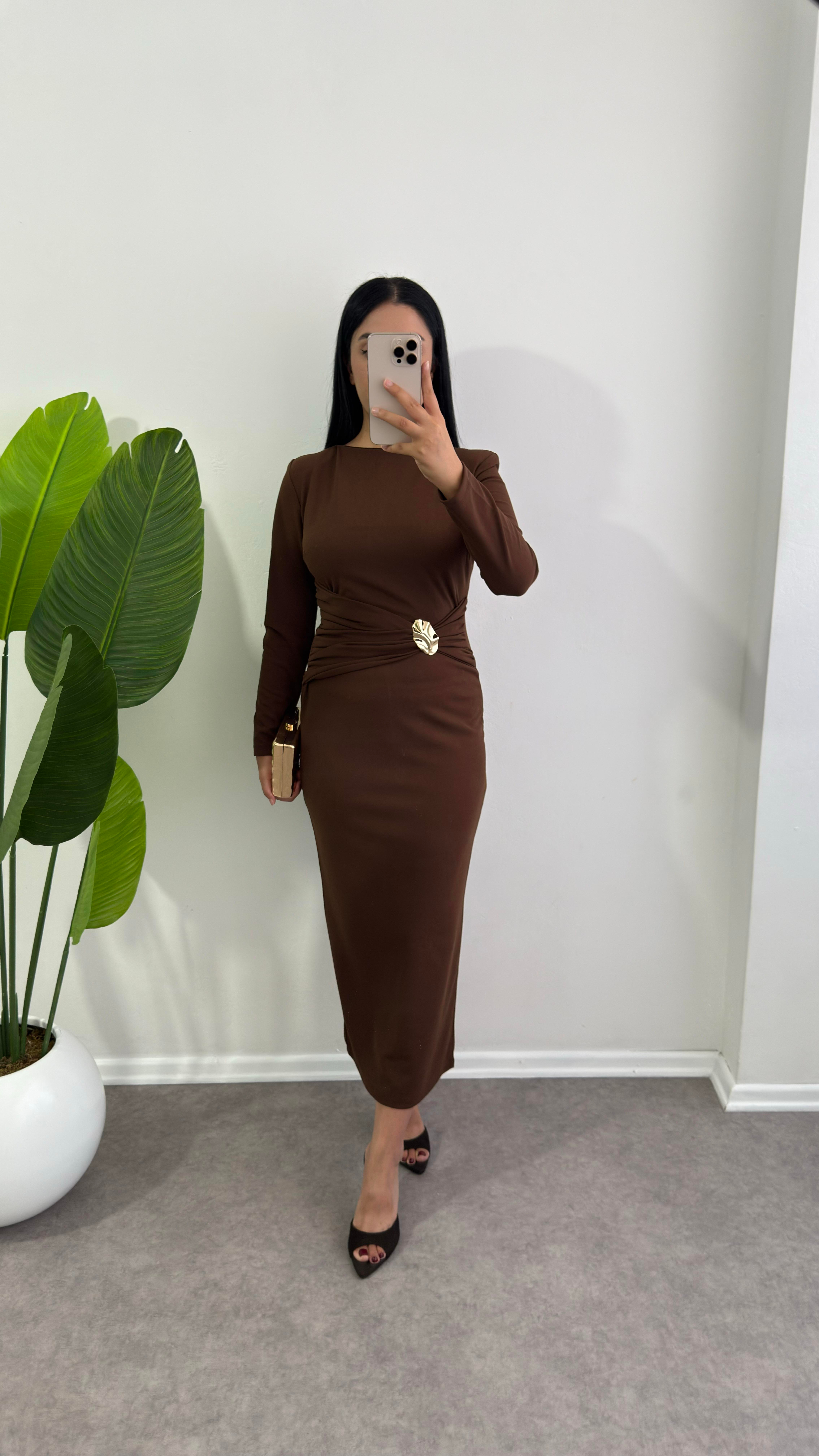 Kahverengi Belden Fiyonklu Broş Elbise