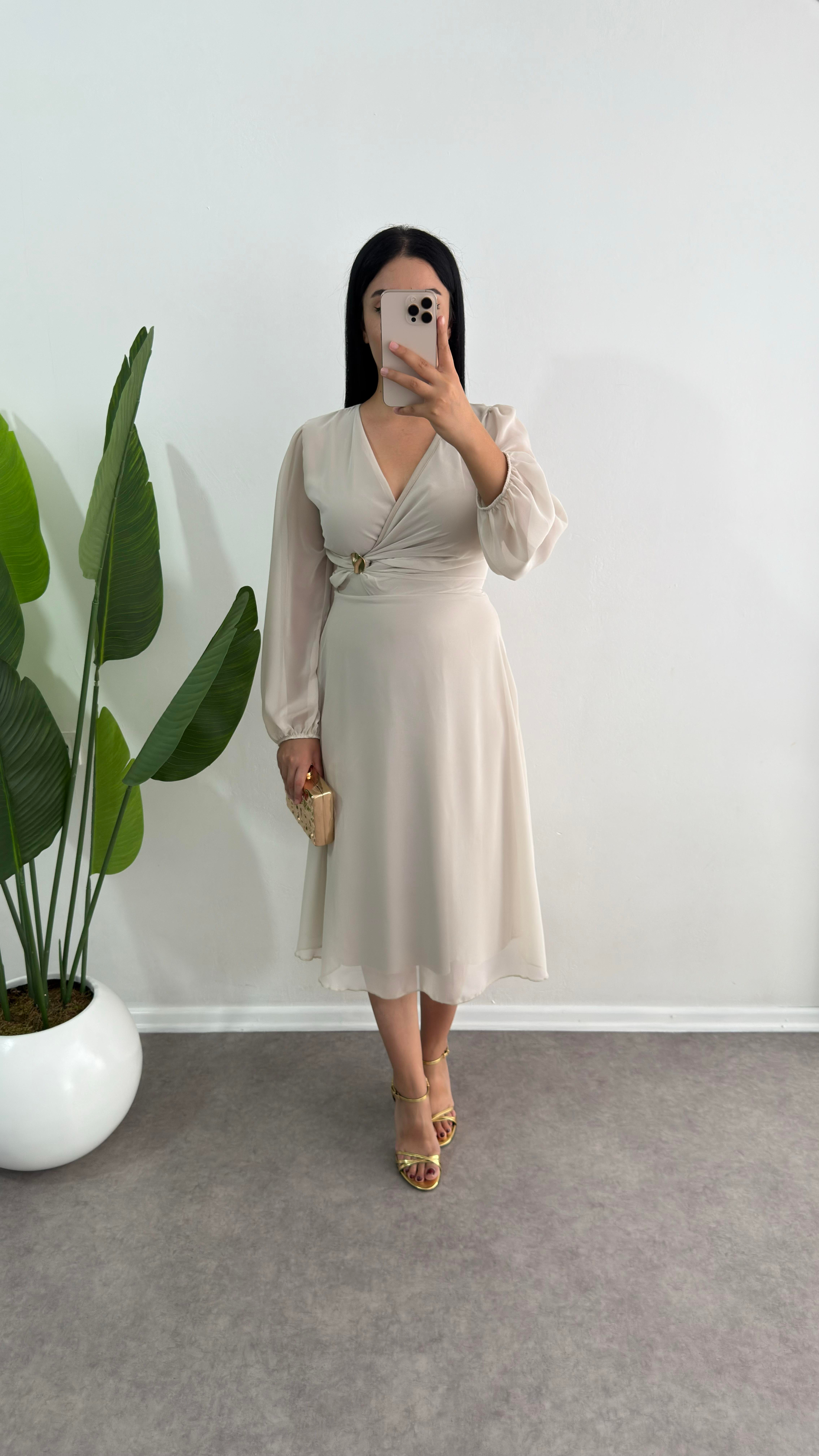 Ve yaka yandan broşlu şifon kumaş içi astarlı uzun kol arkası full kapalı manken 69 kg 170 boy large beden kullandı yandan fermuarlıdır tam kalıptır Arap bedensiniz bir büyük beden tercih edebilirsiniz