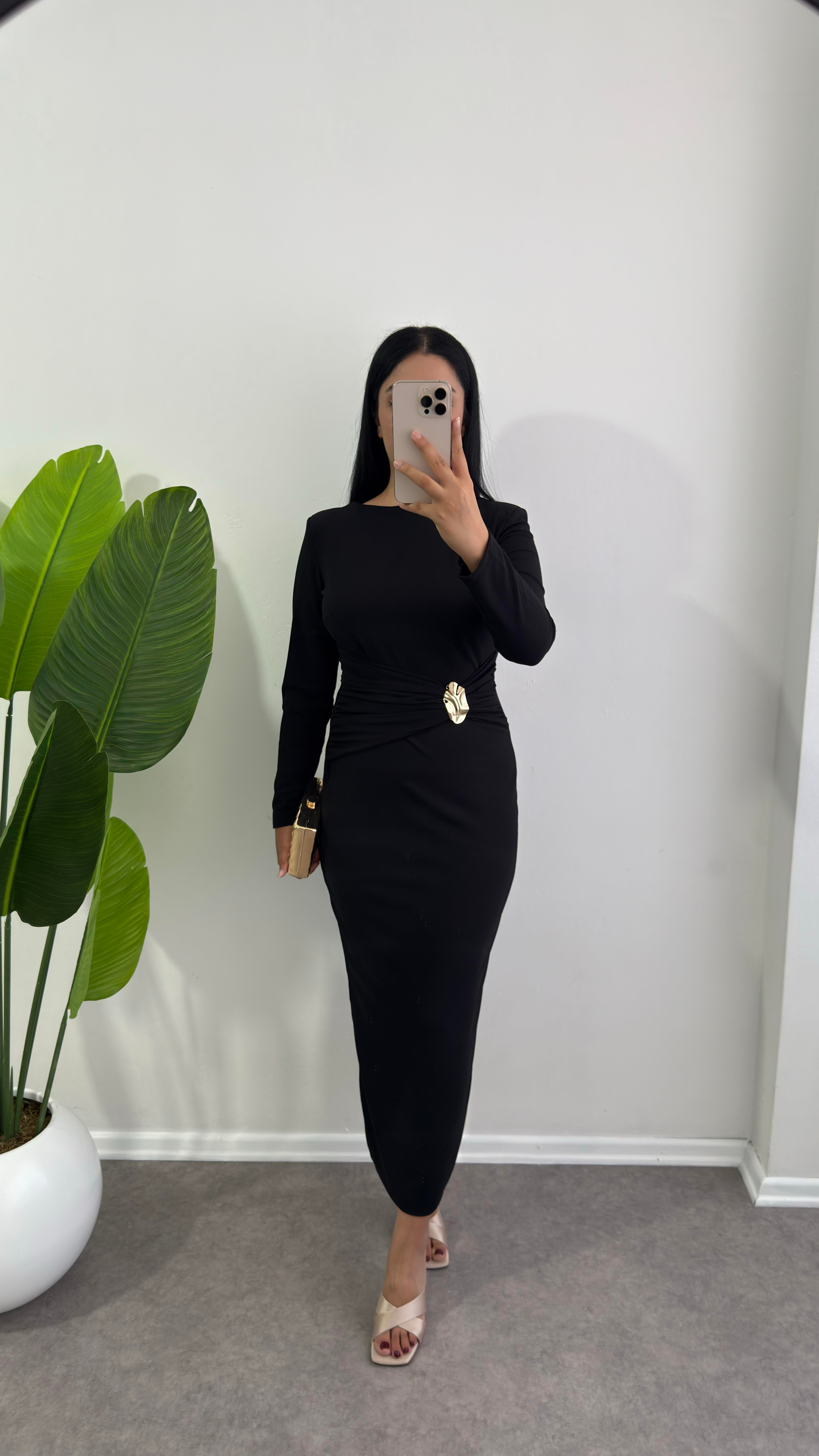 Simit yaka arkadan fermuarlı midi boy belden fiyonk detaylı broş detaylı manken 69 kilo boy 1.70 large beden kullandı örme krep kumaştır esneme payı var