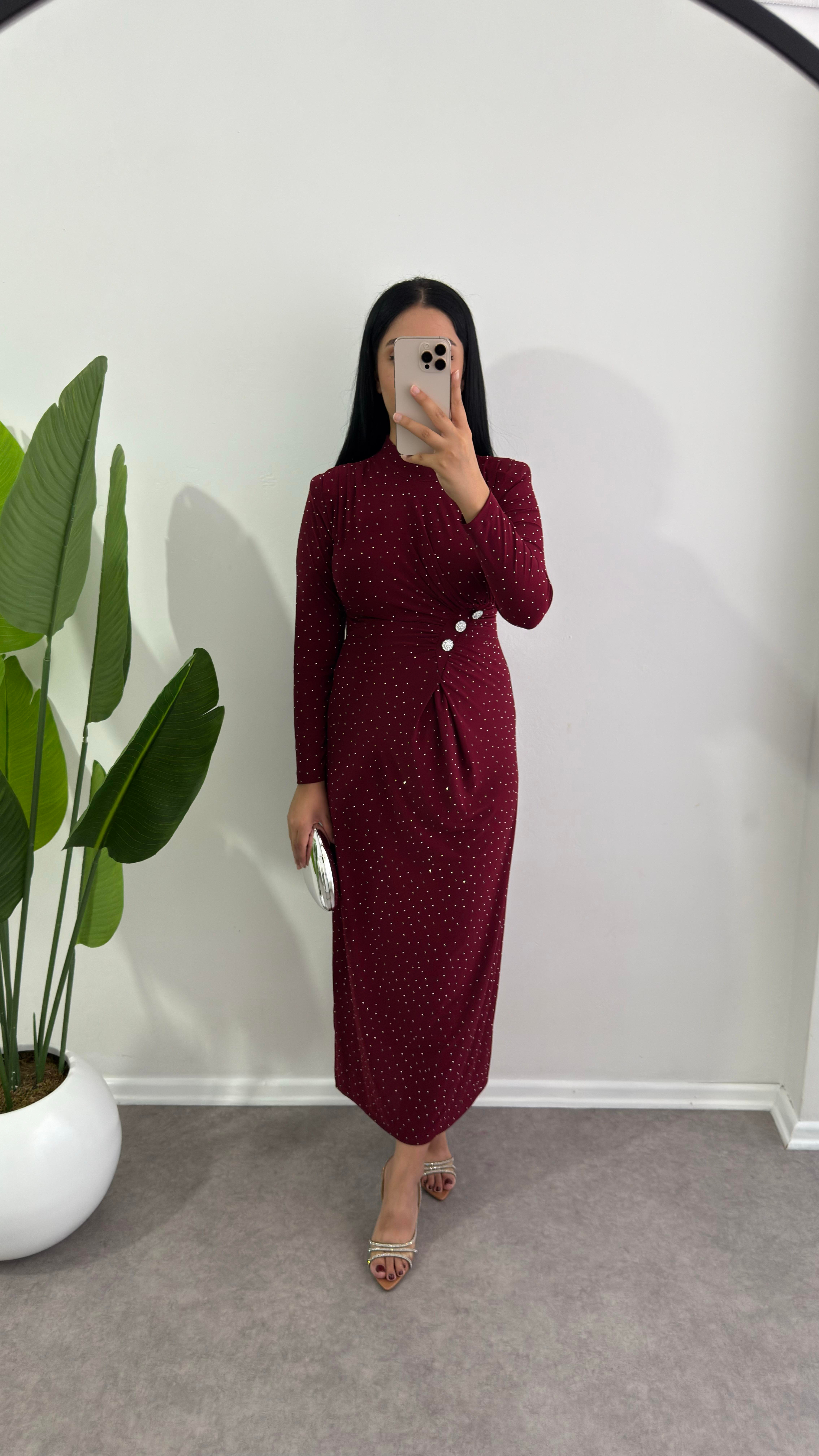 Taşlı dik yaka bel kısmında 3 düğme detaylı sendy kumaş likralı esnek kumaş vatkalı arkadan fermuarlı manken 69 kg 170 boy L kullandı